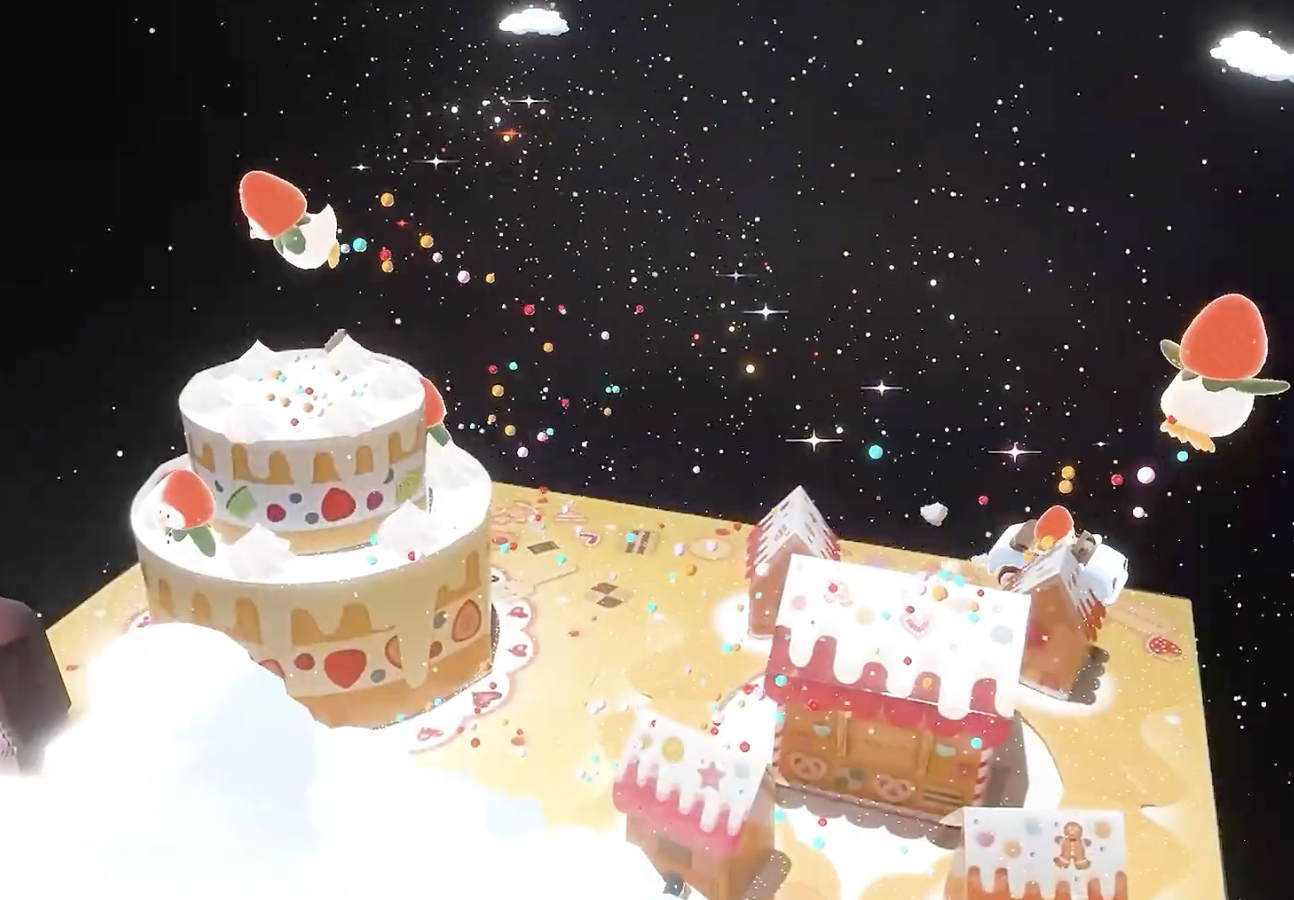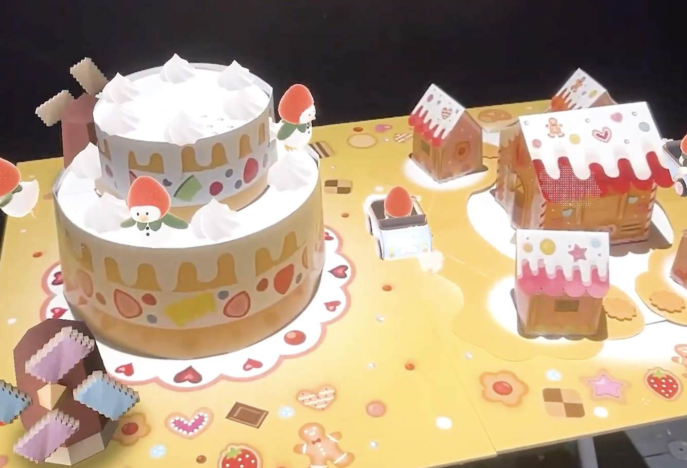 スマホのアプリが、VPS(Visual Positioning System)技術を活用し、ケーキやお菓子の街を立体的に認識する。さらに、キャラクターの位置や奥行きを把握し、建物の裏に隠れたり、視点を変えると違う角度から見えたりする。