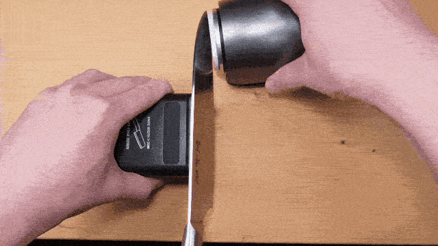 ローラーのスイッチを押すとディスク状の砥石が自動で回転し、それを刃に当ててスクロールしていくことで研ぎ上げられる。
