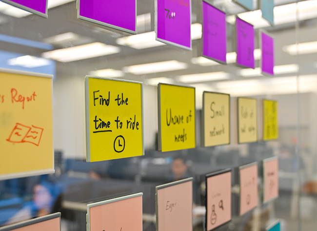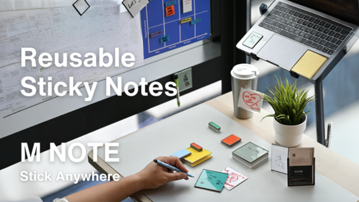 「M NOTE」は磁石とホワイトボードを搭載し、何度も繰り返し使える付箋。さらに粘着性も持ち、金属面以外にも貼り付けられる。