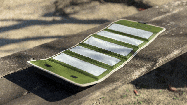 本体は折りたたみ式。充電用のソーラーパネルとモバイルバッテリーが一体化、日中に広げて設置すれば太陽光で充電が可能となる。