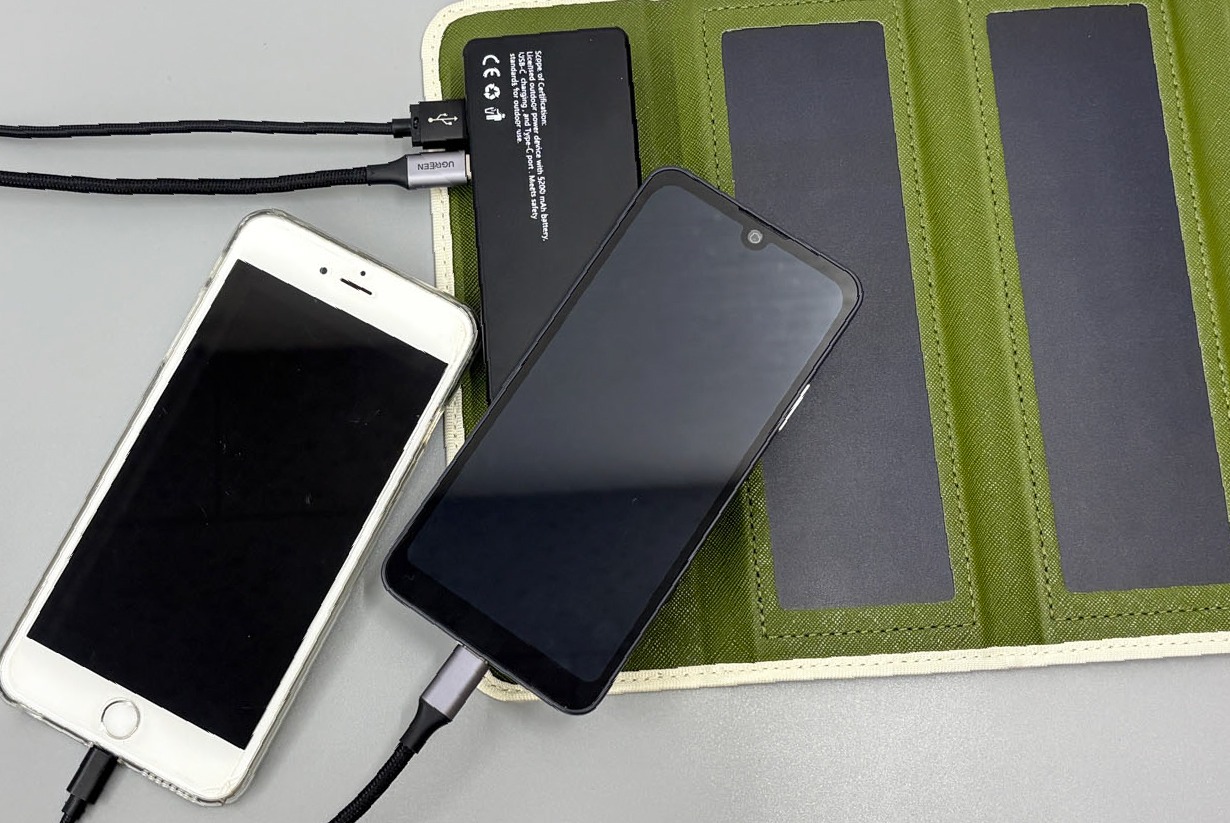 バッテリーの容量は5,200mAh。ソーラーパネルの発電量は10Wで、快晴時なら約4.5時間でフル充電できる。また、USB Type-Cを介した、家庭用コンセントでの充電にも対応する。