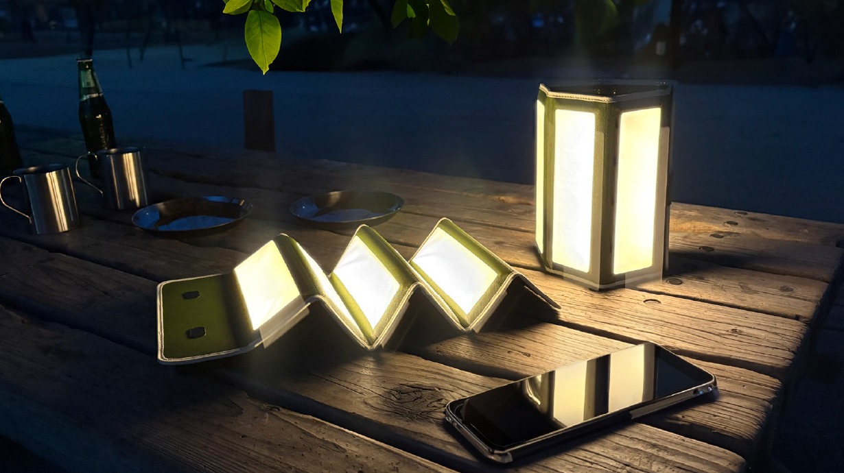 裏面にはLEDライトが搭載されているので、折り畳むとLEDランタンとしても使える。ライトの明るさは65ルーメン、フル充電で約8時間使える。