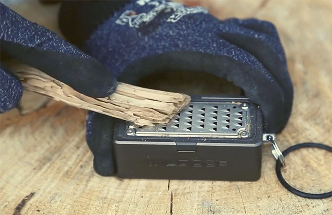 「火の素メーカー」は、枝をおろし金の要領で刃に当てて動かすことで、細かく削られた火口ができあがる。子どもでも30秒ほどで作れるという。