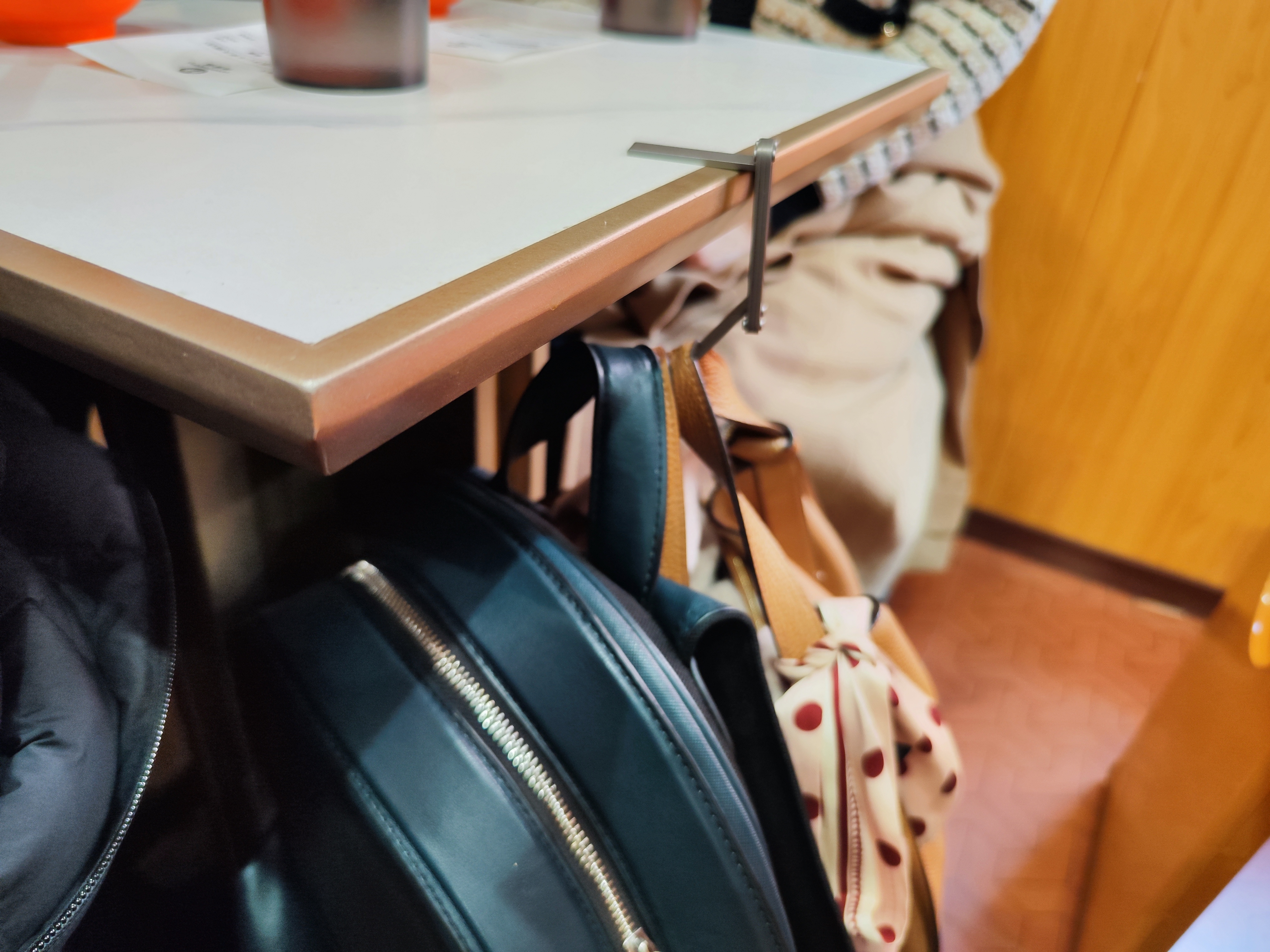 フック先端部の斜め形状がバッグが滑り落ちるのを防止し、さらに滑り止めカッティング加工のアームがテーブルに密着し、ズレを防止する。