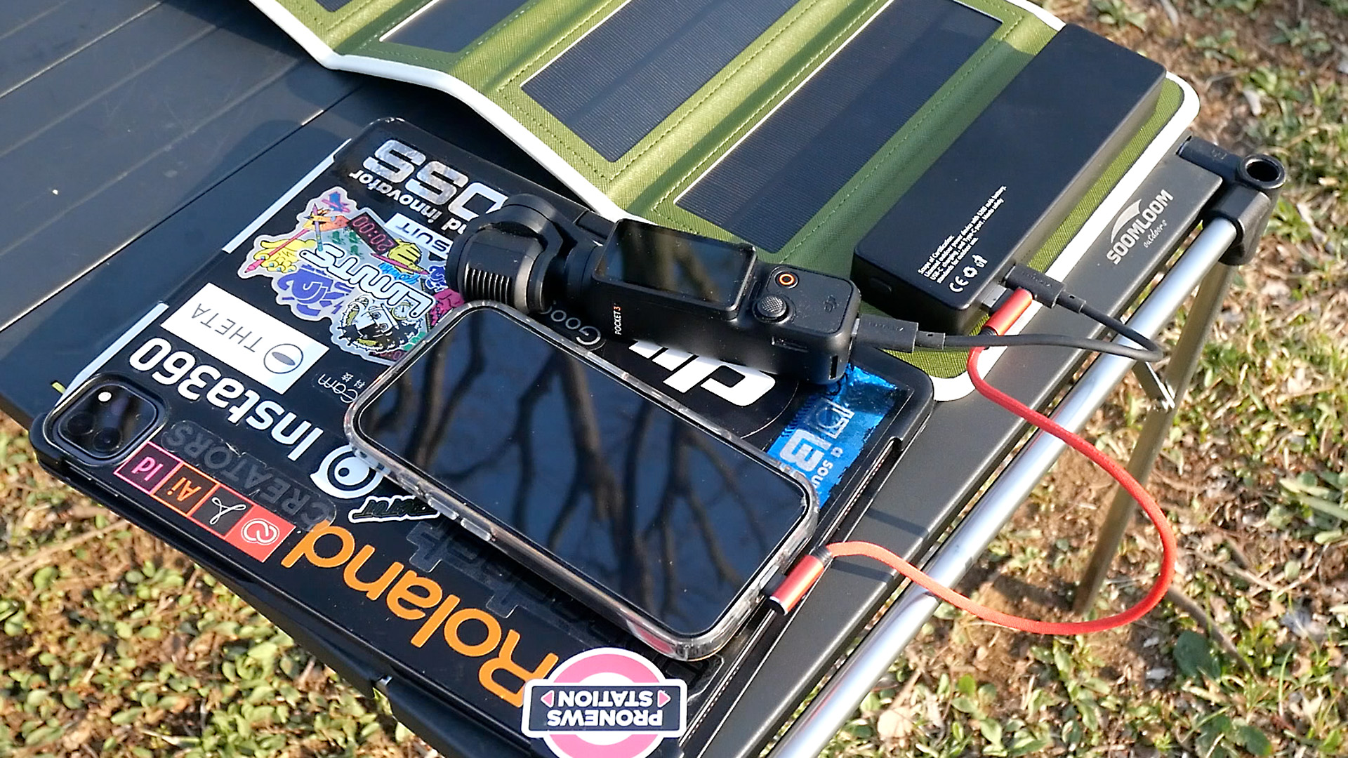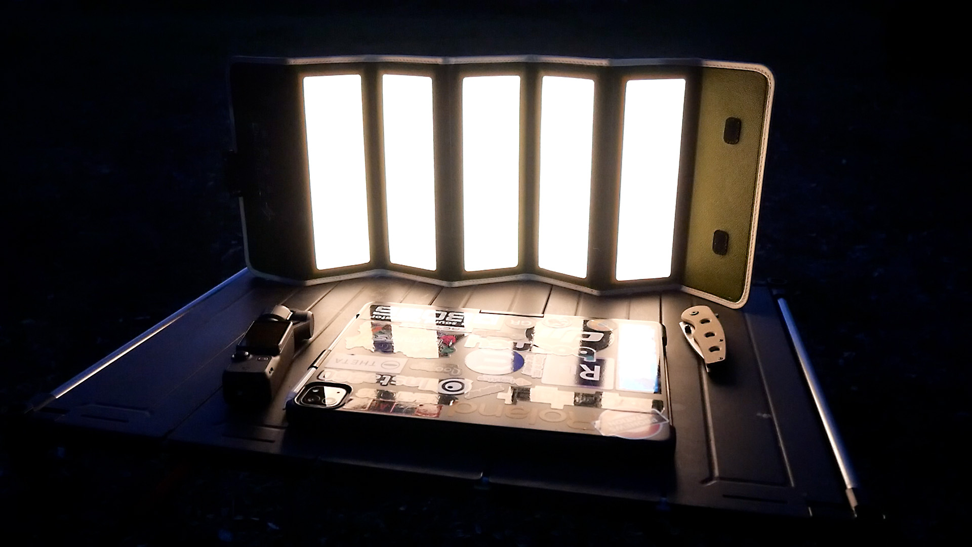 折りたたまれた状態から展開すると、5枚のソーラーパネルが広がります。最大10Wの出力で、5,200mAhのバッテリーを約4.5時間でフル充電可能です。