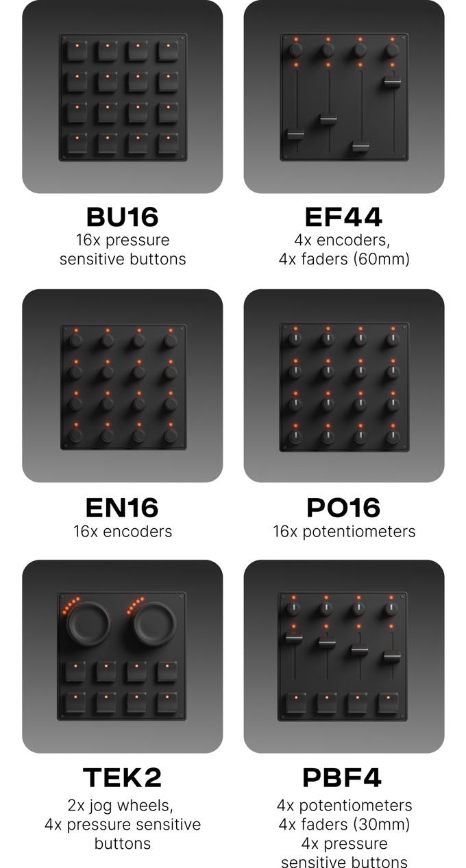 各モジュールは、追加で購入可能。キーボードのほか、フェーダー、ポテンションメーター、エンコーダー、ジョグホイールなどがラインナップされており、用途に応じ組み替えて使用する。