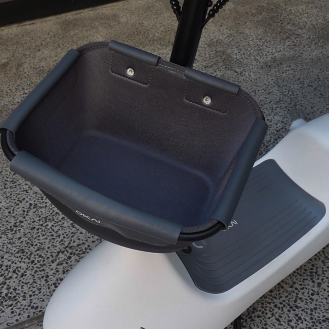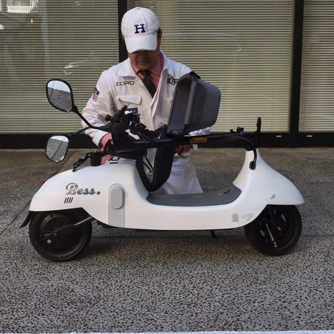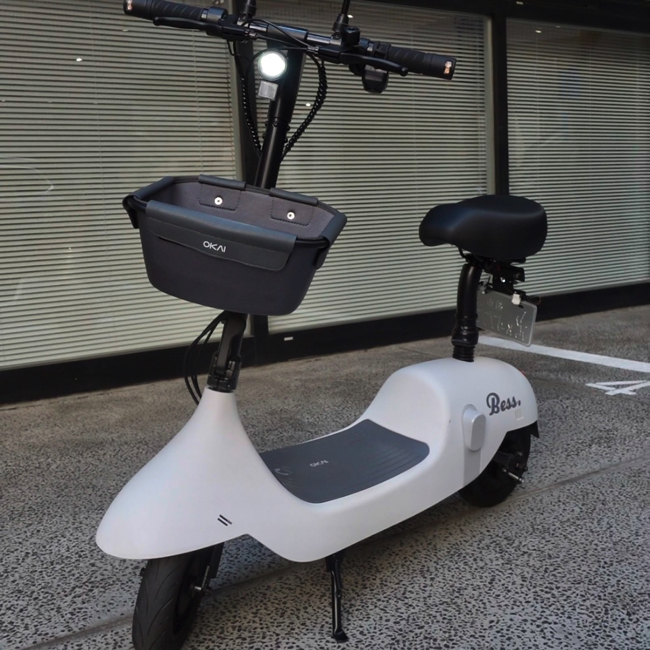「BESS」は、丸みのあるキュートなボディが特徴的な電動バイク。右ハンドルにあるアクセルボタンを押して運転する。前かごがあるため、ちょっとした荷物や、買い物袋などを載せて移動できる。
