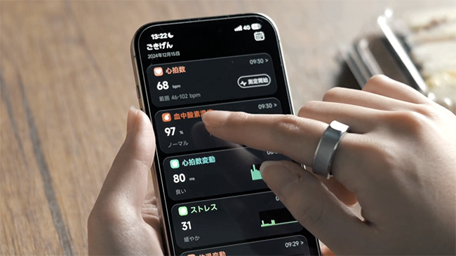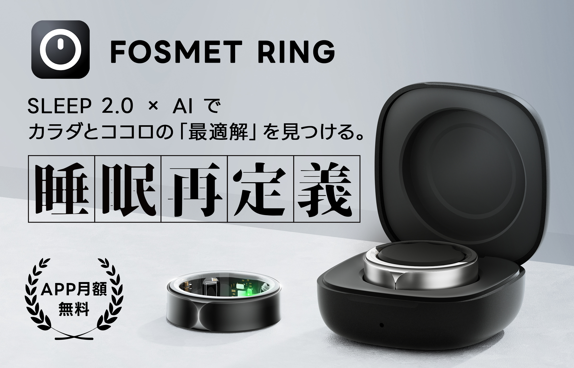 「FOSMET RINGX」は、血管の微動を0.1秒単位で追跡する薄型センサーを搭載。心拍数・睡眠の質・活動量などを検知し、15分間隔で自動記録する。なお記録は就寝中も継続される。