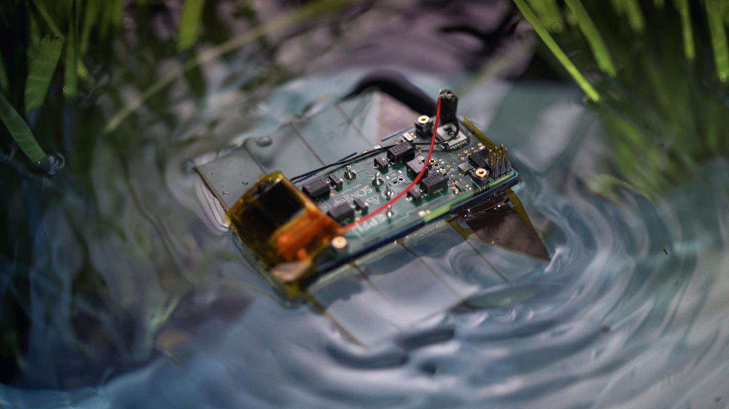 重さは6g。クレカよりも小さなボディに4つの人工筋肉を内蔵し、極薄のフィンを振動させて前進する。プロペラを使わず、静かで自然な動きが特徴で、水中の動植物に影響を与えにくいという。水面に漂う姿は、まるで落ち葉の様だ。