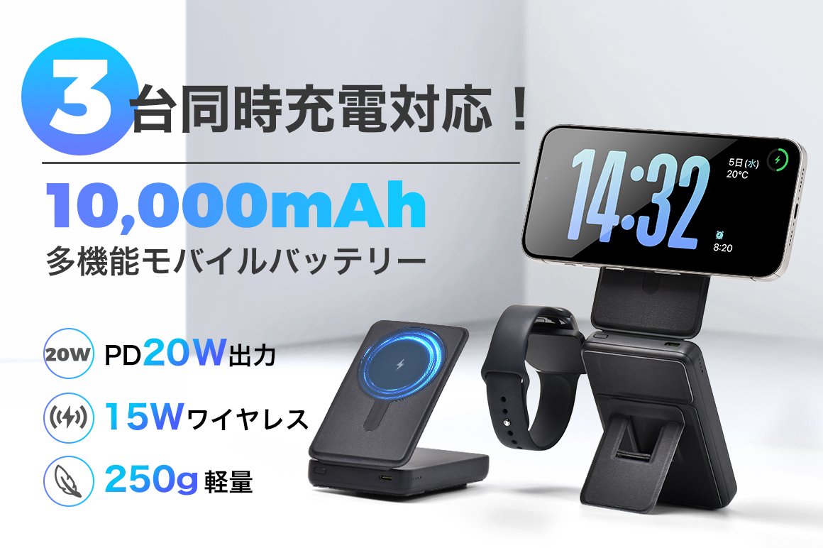 MagSafe対応で15Wワイヤレス+Apple Watch充電+PD20W出力! 3台同時充電&2WAYスタンド機能も! 今までになかった10,000mAhの多機能モバイルバッテリー「FoldCharge」 | Gloture