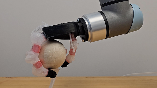 指の関節に空気圧アクチュエータを備え、腕の筋肉の動き(EMG信号の検知)で指を動かし、物を掴んだり持ち上げたりできる。
