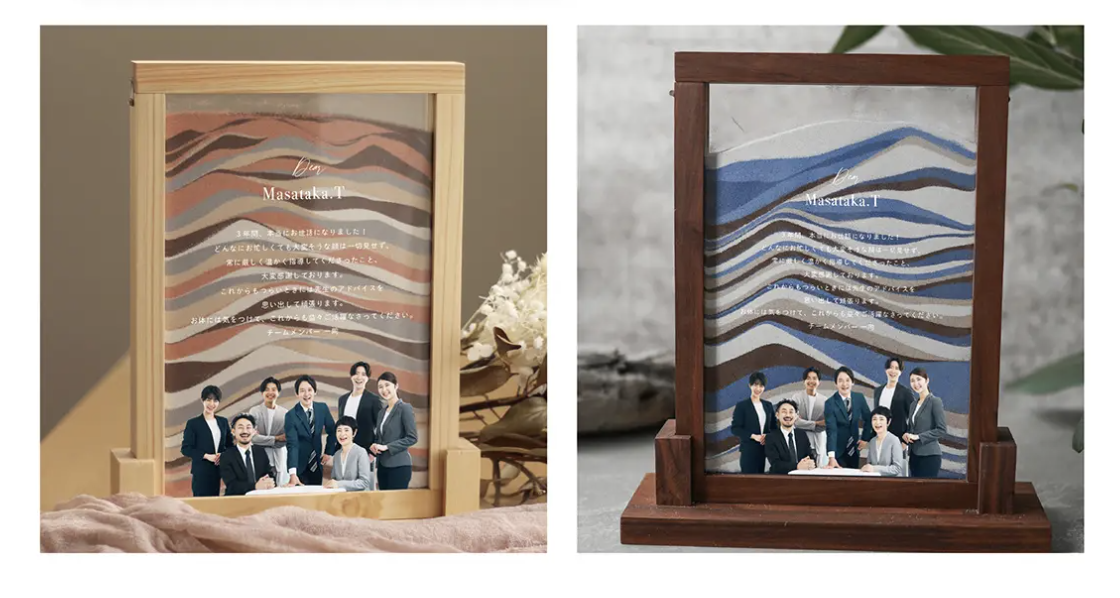 「SUNA ART」は完全オーダーメイド。16色の砂から4色を自由に選べるほか、パネル部分に写真やイラスト、ロゴを追加できる。フレームは、ヒノキかウォールナットから選べる。