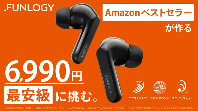 「FUNLOGY Earbuds」は、スピーカーなどの音響機器を販売するFUNLOGY社が手掛けたBluetoothイヤホン。ノイズキャンセル機能搭載で、通勤中やカフェなどでも聞きたい音だけをクリアに楽しめるという。