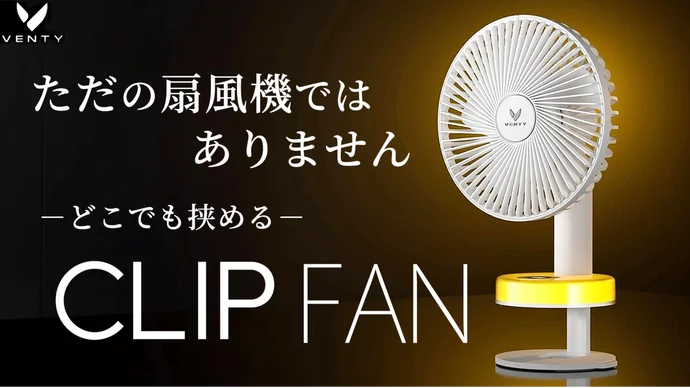 「Venty Clip Fan」は、場所を選ばず設置ができるコードレス扇風機。本体底部がクリップ状になっており、デスク、ベッドサイド、アウトドアなどあらゆる場所に挟んで使用できる。