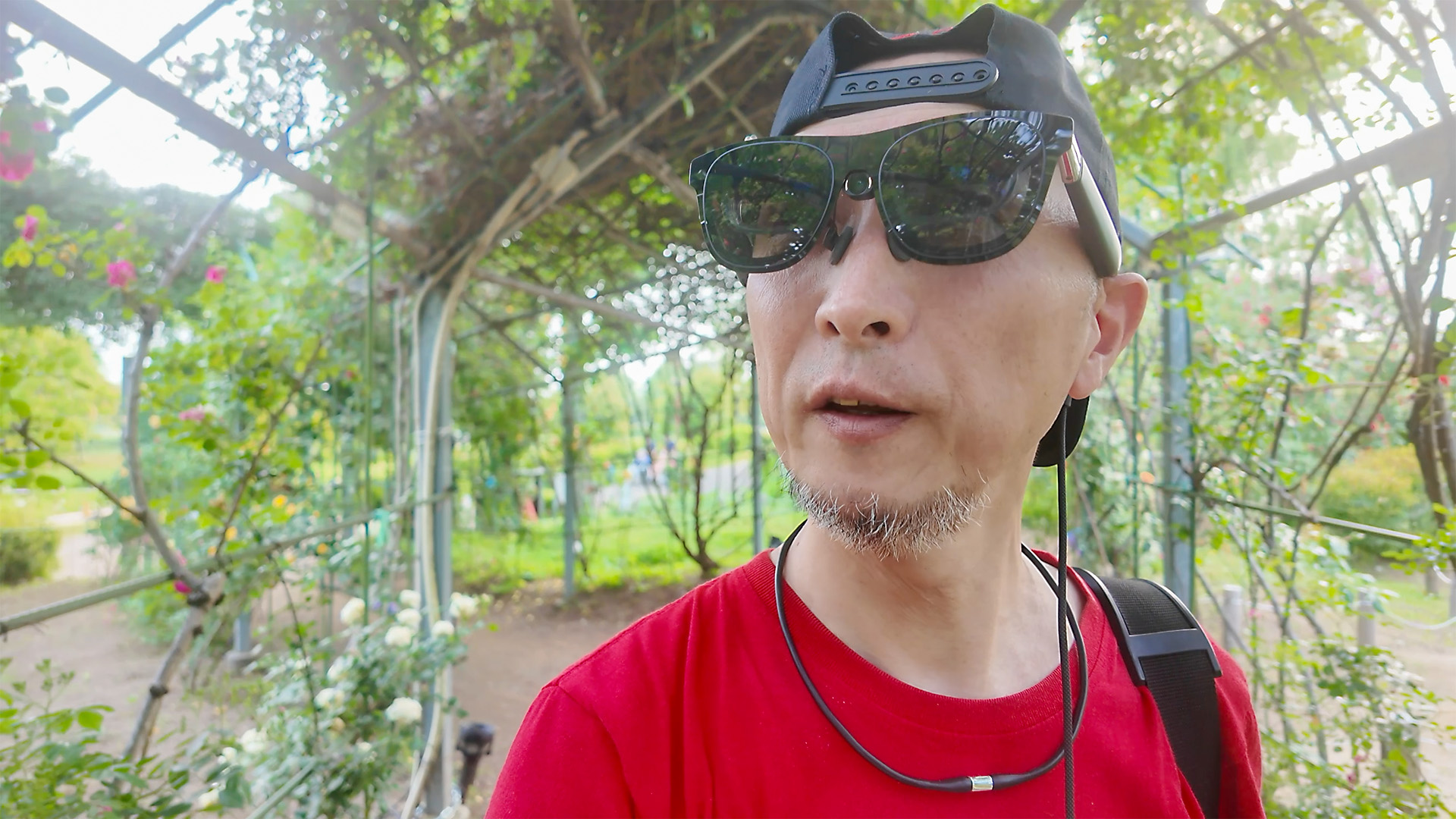 カメラユニットをスマートグラスの眉間部分に装着し、本体のボタンを押すとカウントダウンが始まり写真を撮影。長押しすれば動画を撮影できます。完全な一人称視点になるので、自分の見ている景色や手元の操作をそのまま記録できます。