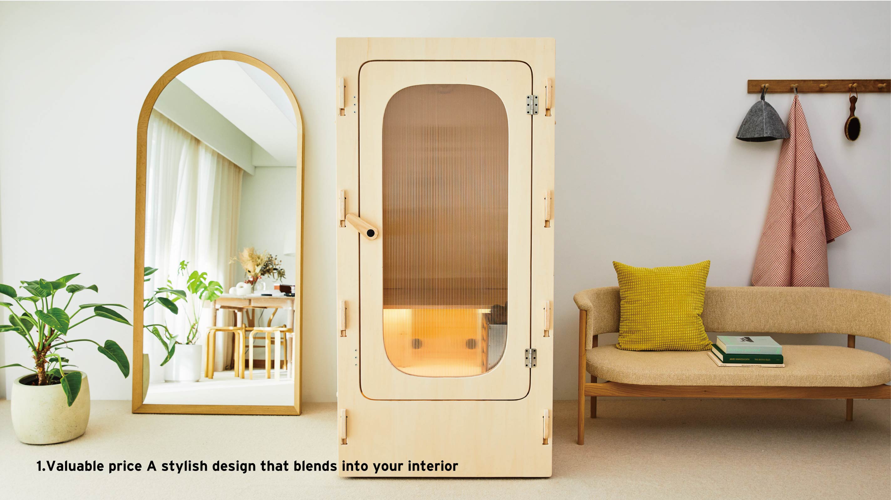 株式会社Calの「TOY SAUNA」は、遊び感覚で導入できそうなボックス型の自宅用サウナ。居間や書斎、寝室、もしかするとオフィスにあっても楽しそうなヤツでした。