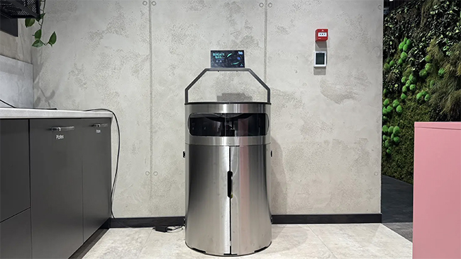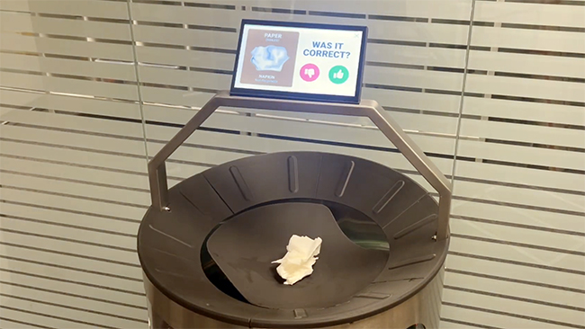 「Ameru」は、フタの上にゴミを置くと、8MPカメラの映像からAIがゴミを判別。フタが回転しゴミが適切なボックスへ落ちるしくみだ。AIは90種以上のゴミを精度95%以上で判別するとしている。