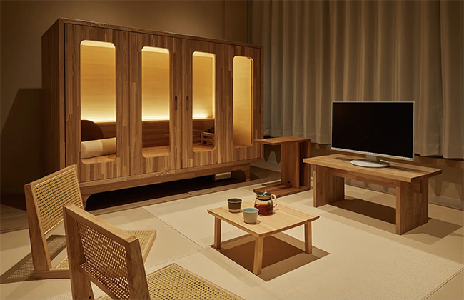 扉を解放すればソファとしても使える。外観は木目が美しいタモ集成材仕上げで、洋室にも和室にもなじみやすいデザイン。ライトは気分や雰囲気に合わせて調光可能だ。