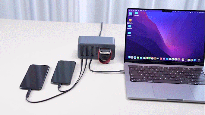 充電ポートはUSB Type-Cが3つ、USB Type-Aが1つで合計4台のデバイスを同時充電できる。出力は最大合計200W。付属のアダプターを使用すればLightningタイプの充電も可能。