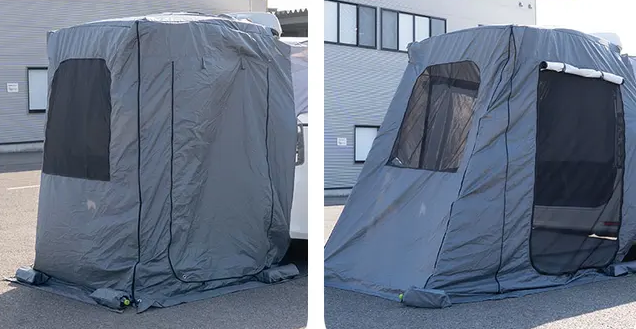 3面の大きなメッシュ窓で通気性を確保し、ファスナーで外部からの視線を遮断できる。車体下の隙間を埋めるアンダーガードも付属し、足を置けるので着替えをする際にも便利だ。車内とテント内を自由に行き来できるので、車中泊にも活用できる。
