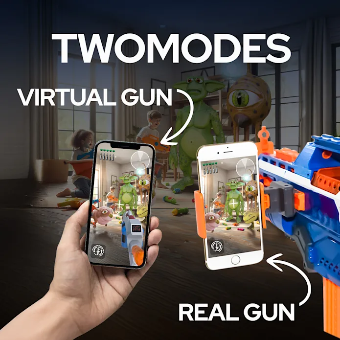 スマホアプリをインストールし、スマホをNerfに装着すると、現実空間に仮想のターゲットやエフェクトをAR表示する。画面に広がるAR世界で、臨場感あふれるシューティングゲームが展開される。