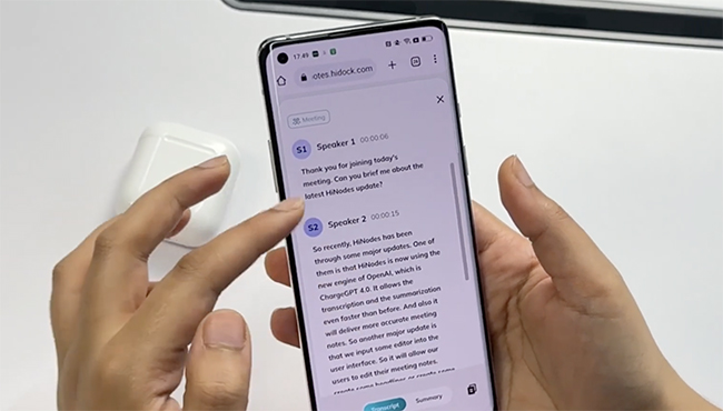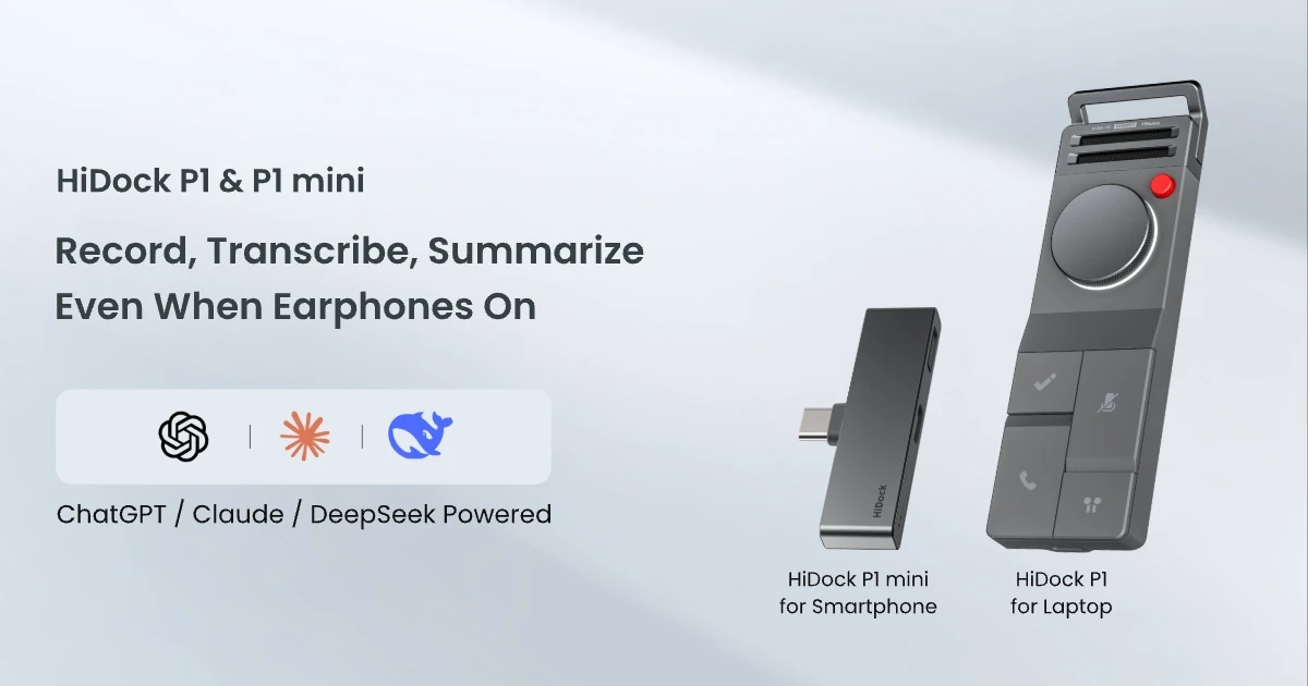 「HiDock P1 mini」は、Bluetoothイヤホンを通してのWebミーティングや通話を録音できるボイスレコーダー。さらにAIによる要約や翻訳も得られる。