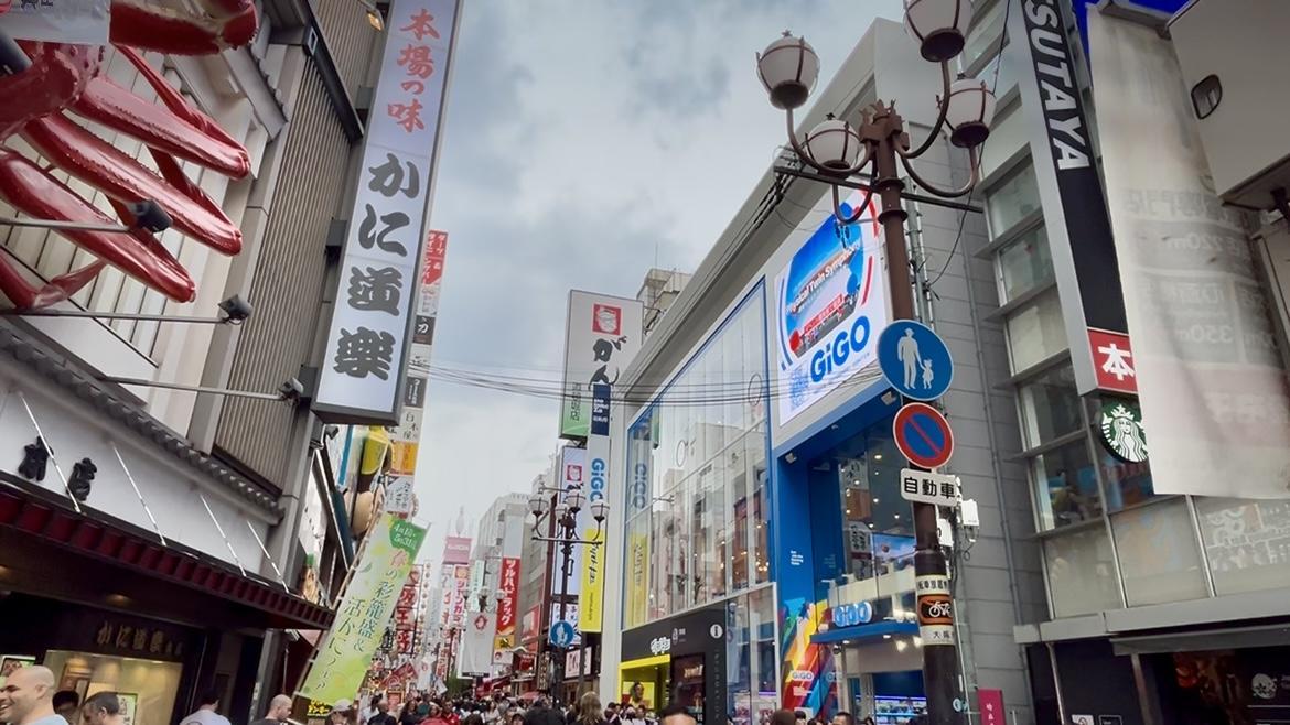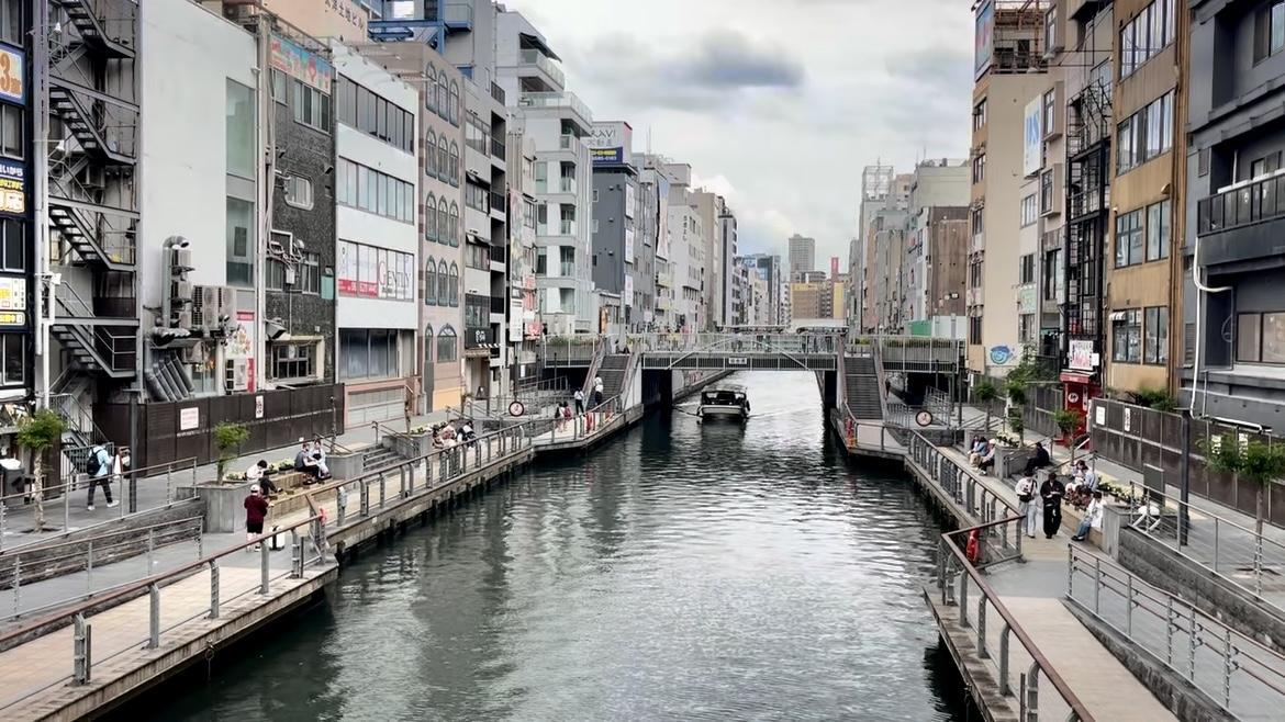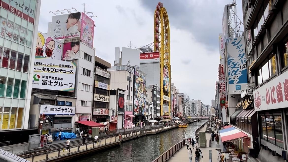 戎橋筋商店街を通り抜けると、道頓堀川に架かる戎橋へ。南詰は道頓堀商店街に接し、北詰は心斎橋筋商店街へと続く、界隈の繁華街の中心だ。橋の上からは道頓堀川沿いの水辺を見下ろせ、大阪名物のグリコサインのビューポイントとして、多くの人で賑わっている。