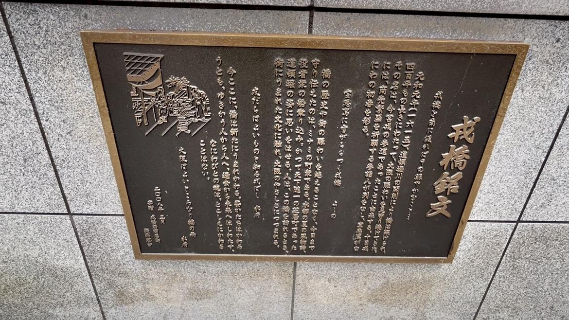 南詰には親柱を模したモニュメントが立ち、そばの欄干にはめられた銘板には、橋の歴史が刻まれている。戎橋は道頓堀川の開削とほぼ同時の、1615年(元和元年)に架橋。商売繁盛のえびす様を祀る、今宮戎神社の参道にあたり、橋名の由来は今宮戎と関連があるとも。ほかにも千日墓地への墓参や、橋の南側にあった竹本座などの芝居小屋や劇場へと通う客など、多くの人々に利用されてきた橋である。