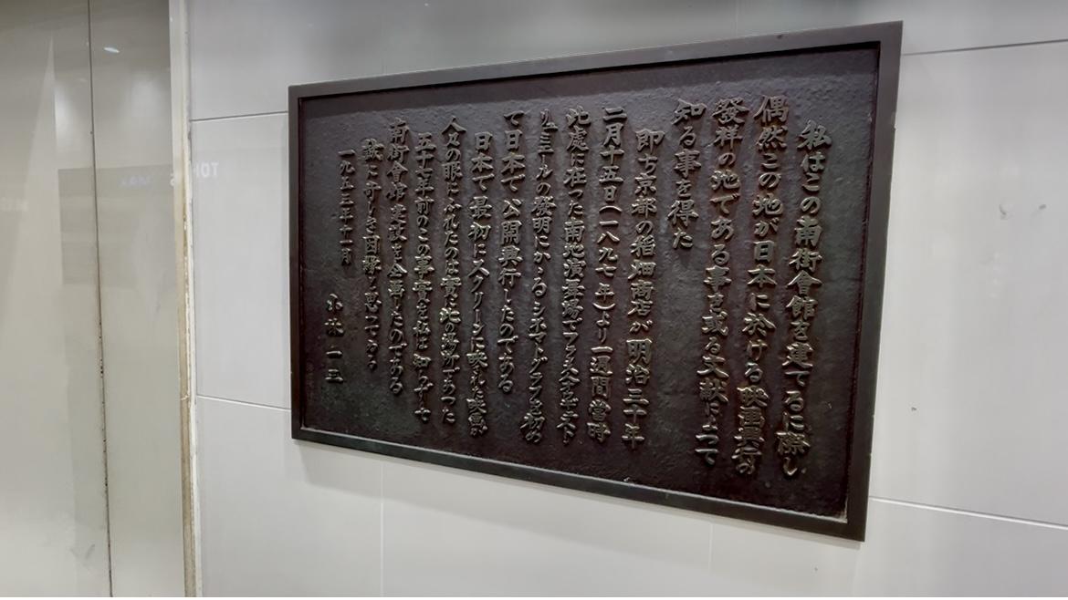 南海電鉄のなんば駅から続く戎橋筋商店街の入口に建つ、TOHOシネマズなんば本館。エレベーターホールの壁面にはめられた銘板が、映画興行発祥の地を示している。前身の南街会館が1953年(昭和28年)に完成した際、当時の東宝株式会社の社長であった小林一三氏が、このことを顕彰して設置されたものだ。