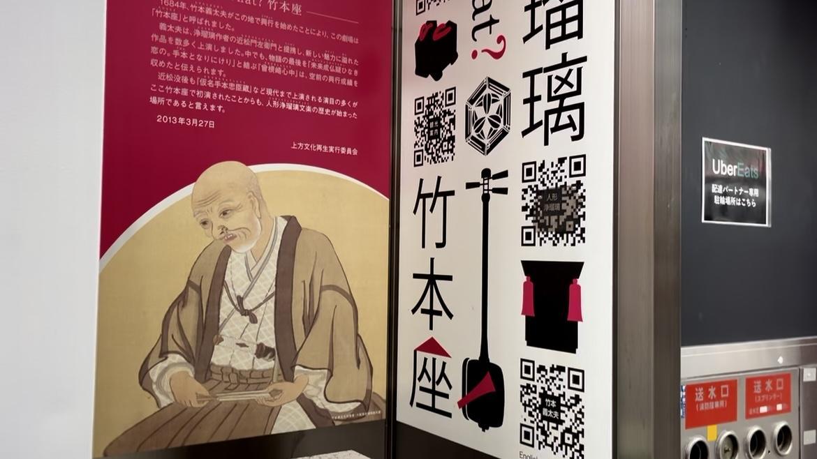 動く巨大看板の前に位置する人形浄瑠璃の原点