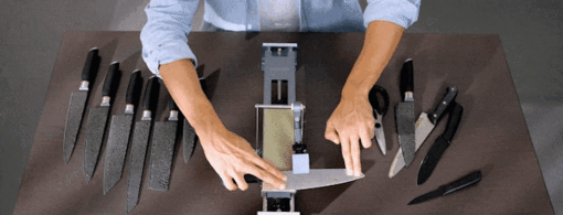 「Cheefarcuut」は、4 mm厚のダイヤモンドストーンと仕上げ用のレザーパッドで、刃先を丁寧に仕上げる。果物ナイフや出刃包丁はもちろん、はさみ用クランプを使えば、キッチンバサミや万能バサミにも対応する。