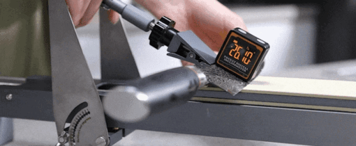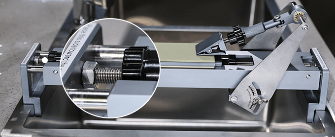 工業用ベアリングとデュアルリニアレールにより、ブレのない動きで均一に研磨でき、角度調整はデジタル表示の計測器で±0.1°単位の微調整ができる。