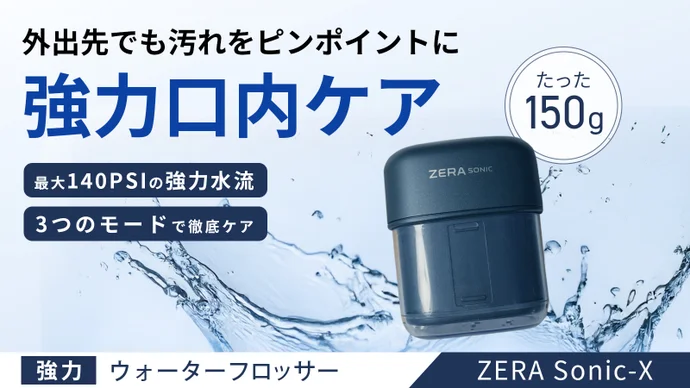 「ZERA Sonic-X」は重さ150g以下、ポケットサイズのウォーターフロッサー。コンパクトながら、最大140PSIの水流で歯を洗浄できるという。