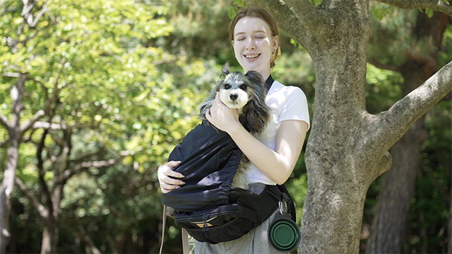 「ヒップシートEX」は、ベビー用品メーカーの日本エイテックスが開発した犬用だっこ紐。散歩中に犬をラクに抱っこできる他、収納や飛び出し防止カバーなど複数の機能を搭載している。