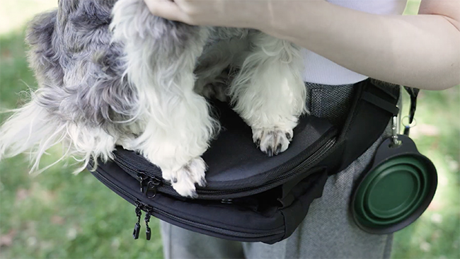座面は犬が安定して座りやすいスクエア型で、滑り止め加工も施されている。座面下に収納スペース、ベルトにホルダーも搭載し、外ポケットの中身は犬を抱っこしたままで出し入れ可能だ。
