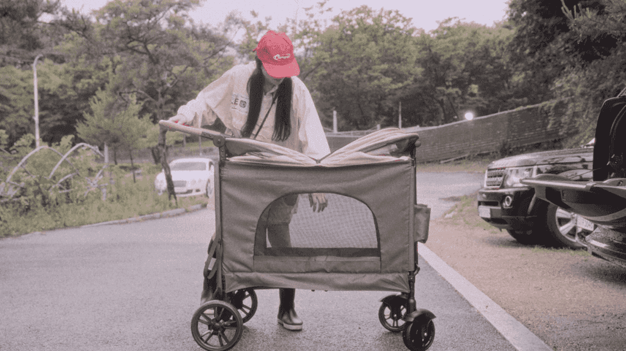 「Go HOUT マルチペットカート」はワンタッチで折りたためてコンパクトに収納可能。耐久性・耐摩耗性に優れるPU素材のタイヤを採用し、前輪は360°回転式で方向転換しやすい。