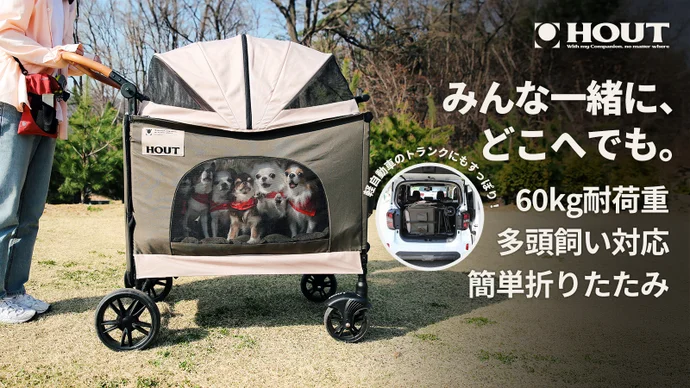 「Go HOUT マルチペットカート」は内部スペース80 × 51 × 50cm、耐荷重60kg、大型犬や多頭飼いにも対応するワゴン型ペットカート。普段は重い荷物を運ぶキャリーカートとしても使える。
