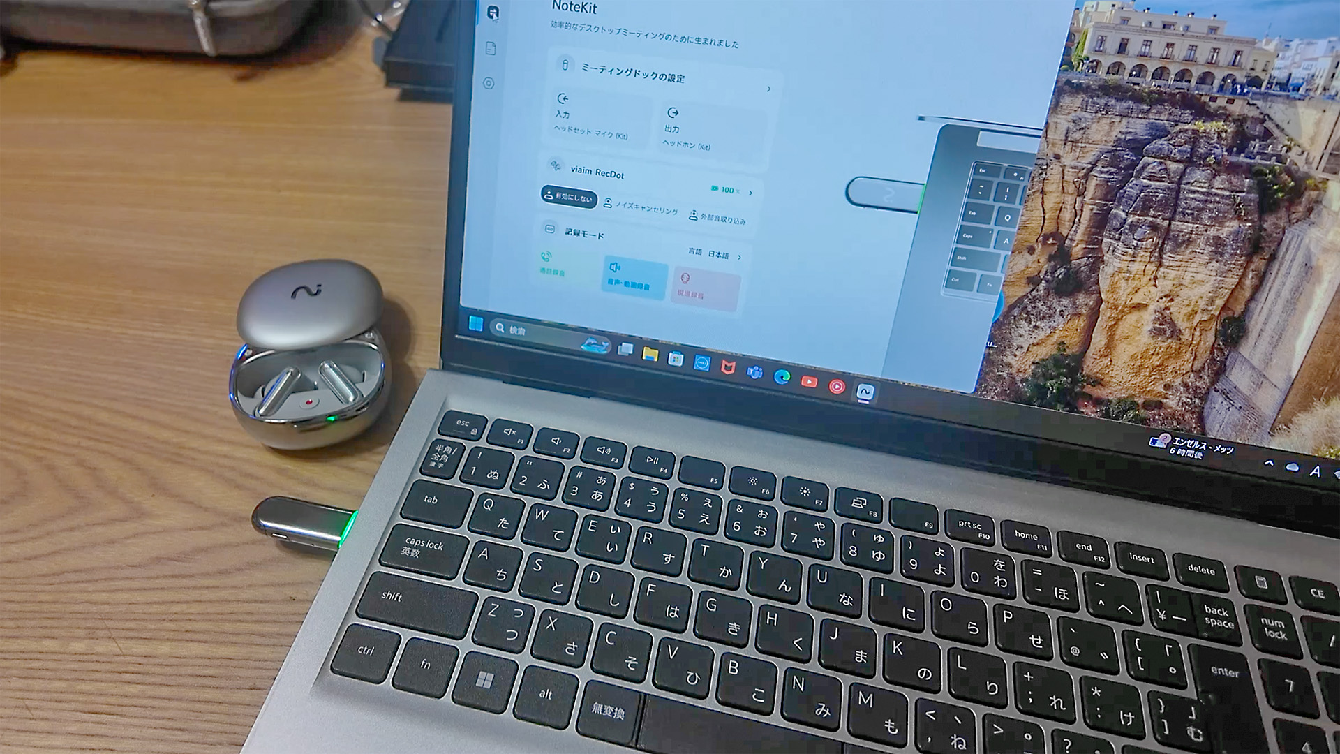 パソコンで使用するにはUSB型AIレコーダー「NoteKit」と連携します。マイクだけでなくシステム音声の入力にも対応しているので、ネット動画の字幕生成やオンラインミーティングなどでも活用できます。