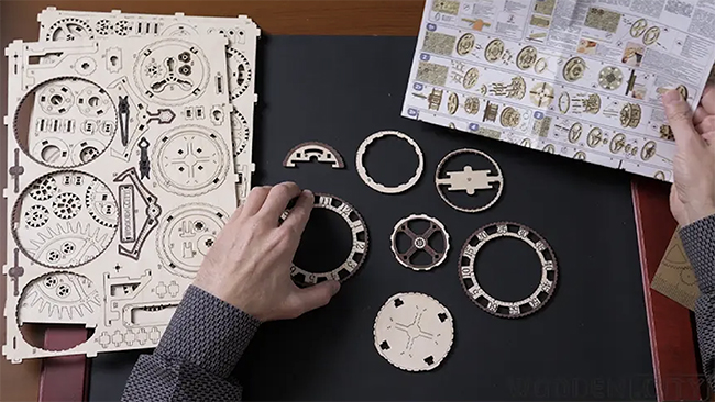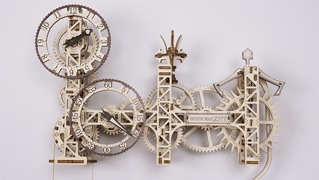 「Steampunk Wall Clock」はポーランド発の木製壁時計製作キット。接着剤や専用工具が不要で、重りと歯車によって電池なしで駆動する。