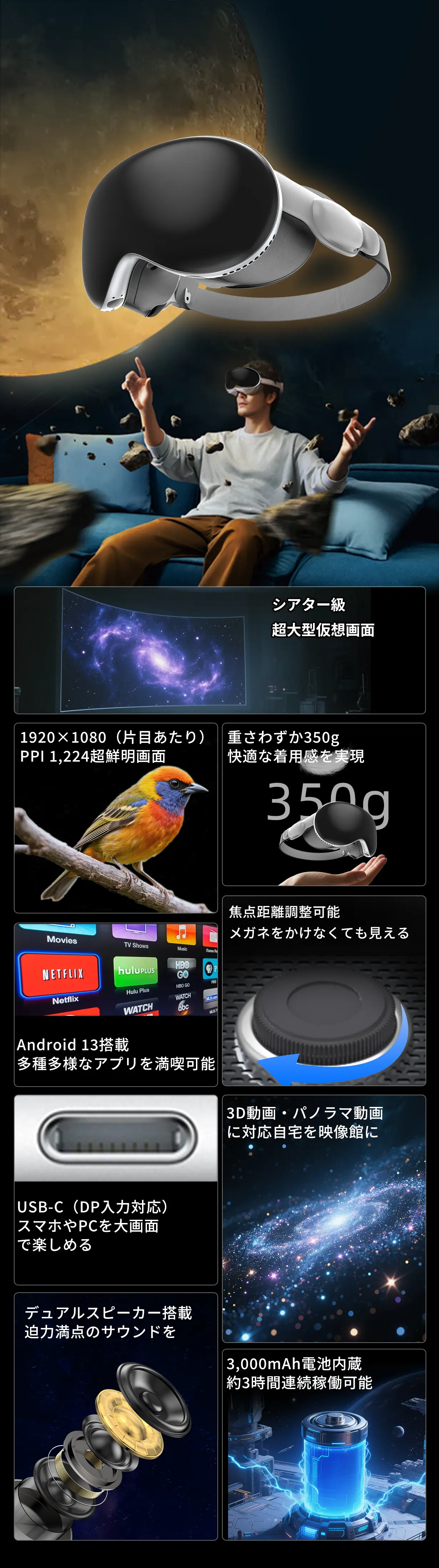 「Vision Lite」は、Android 13搭載によるワイヤレス設計と、1,224ppiの高精度を両立したヘッドマウントディスプレイ。映画館のような大画面を、煩わしい配線なしで体験できるという。