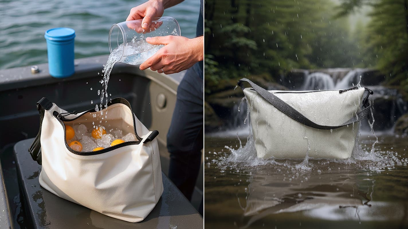 縫い目のない高周波溶着加工と、IP67相当の気密ファスナーを組み合わせることで、液体が漏れ出すのを防ぐ設計。氷水などの液体を、内部にそのまま入れる事も可能で、横倒しになってもこぼれない構造だという。