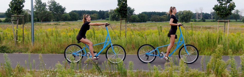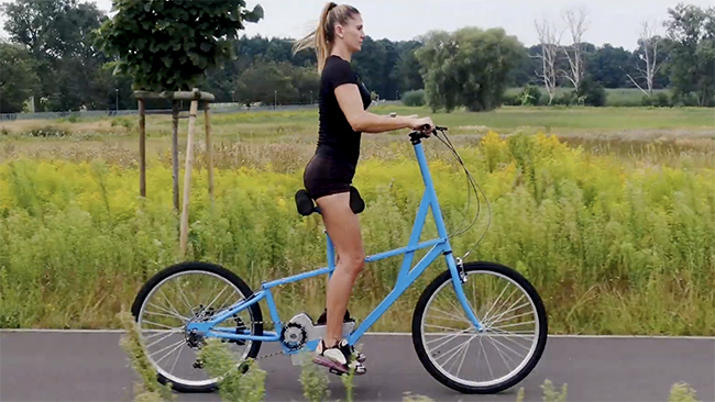 「Shape-Me Bike」は、レッグサポートに太ももを挟み、全身の前後運動によって推進するしくみになっている。