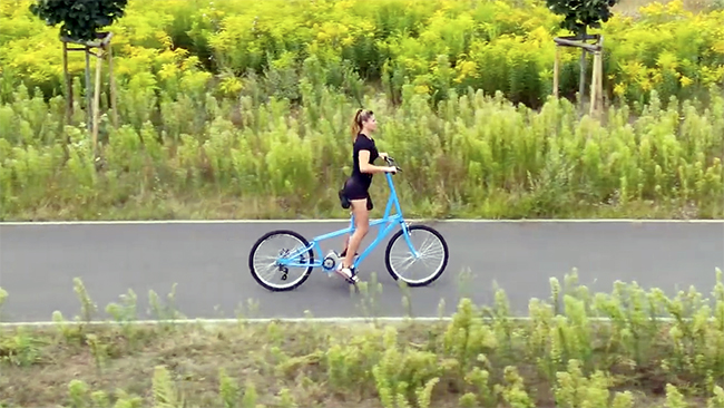 乗り降りや方向転換が大変そうに思えるが、紹介動画では折り返しをスムーズに行っている様子が確認でき、慣れれば意外と乗りやすいのかもしれない。駆動機構にはギア・フリーホイール・チェーンなど一般的な自転車の部品を採用し、メンテナンスしやすいとしている。