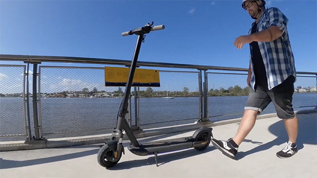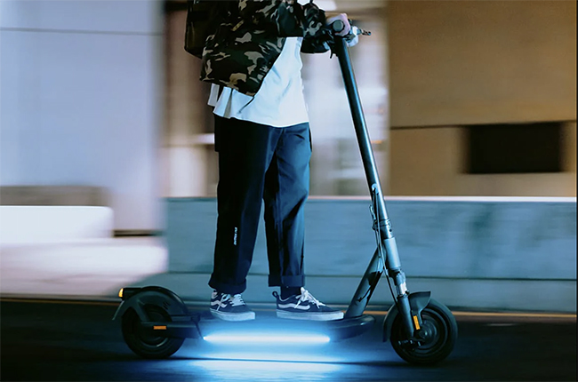 前輪とボードそれぞれにデュアルサスペンションを搭載し衝撃をしっかり吸収。ヘッドライトに加え、ボードのサイドにもLEDライトを搭載し、夜間走行時の視認性を高めている。