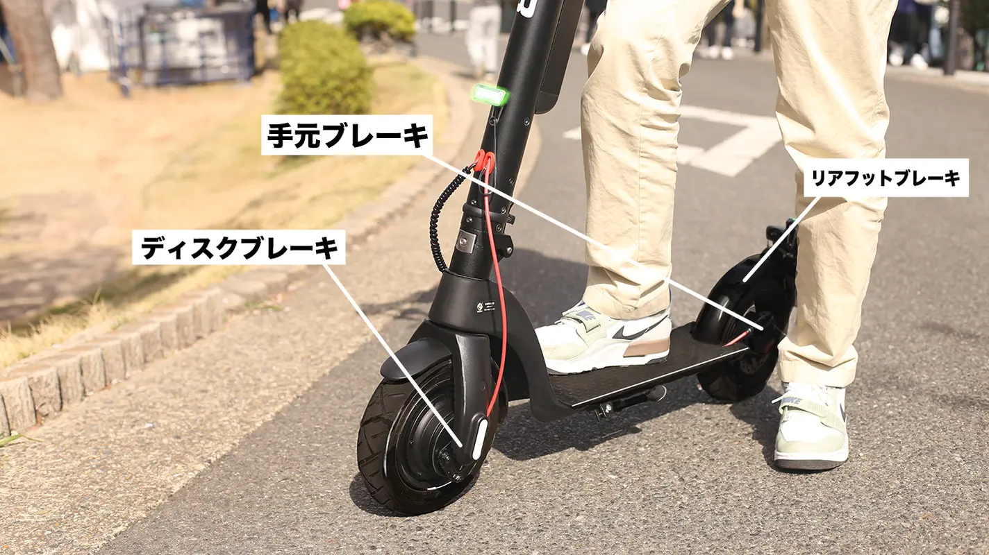 ブレーキは、手元・ディスク・フットの三重ブレーキシステムを装備。足回りは、クッション性に優れた10インチのエアタイヤを採用している。ハンドルは折りたためる仕様だ。