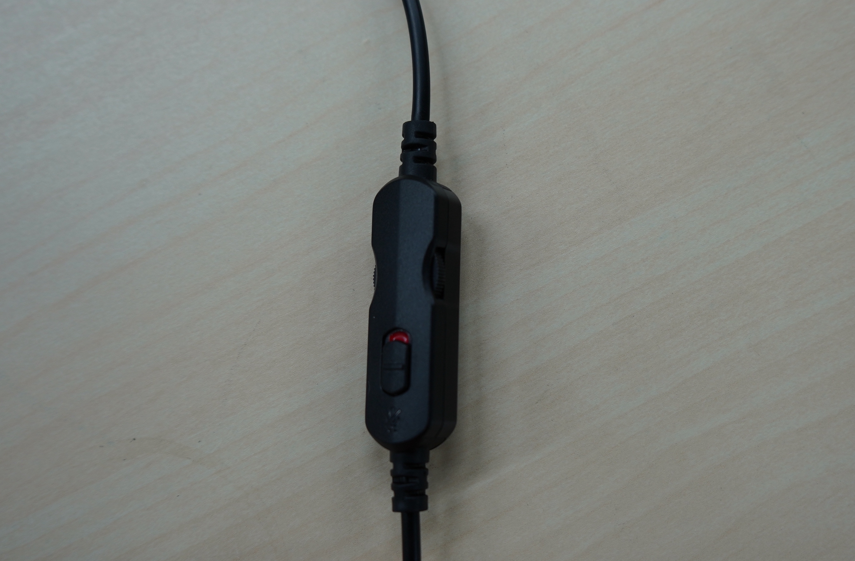 ケーブルにはオーディオコントロールがついています。サイドのダイヤルで音量の調整、真ん中のスイッチではマイクのミュート操作が可能です。